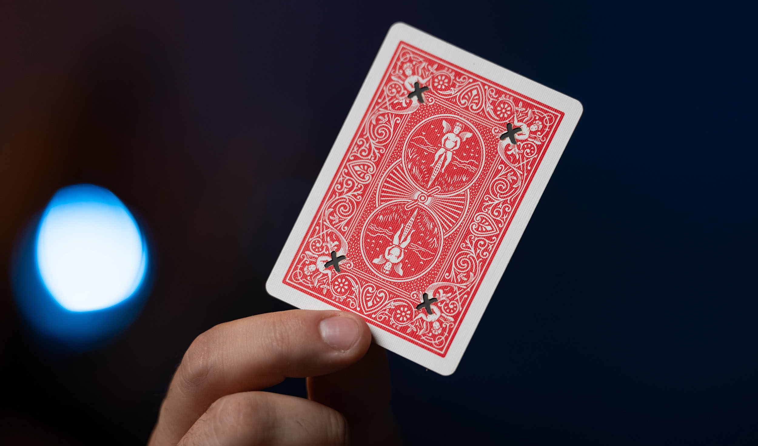 A brilliant gimmick that allows you to perform an impossible piece of magic. A spectator selects ANY card and signs the face. 4 black X'S are drawn, one in each corner on the back of the signed card. No covering of any kind the X'S visually jump one at a time into the top left corner.